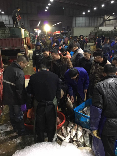 深夜12時(shí)到6時(shí),當(dāng)人們睡在溫暖的被窩里做著美夢(mèng)的時(shí)候,通農(nóng)物流水產(chǎn)交易區(qū)卻燈火通明,熱鬧非常,來自浙江、山東、崇明、蘇州、常州等地的商戶在這里云集,他們穿著棉大衣,高到膝蓋的雨靴,穿梭在交易區(qū)內(nèi)吆喝著、買賣著。各種海鮮湖鮮,市面上有的蝦兵蟹將這兒都有,如東商戶錢興旺做海鮮生意,從各大碼頭上貨再運(yùn)到市場(chǎng),晚上精神白天困,已經(jīng)算是一種職業(yè)病了。數(shù)九寒冬,為防止地面結(jié)冰車輛行人打滑,交易區(qū)組織工作人員每天往地面上撒鹽,他們的理念是:商戶發(fā)財(cái),市場(chǎng)才能興旺。
