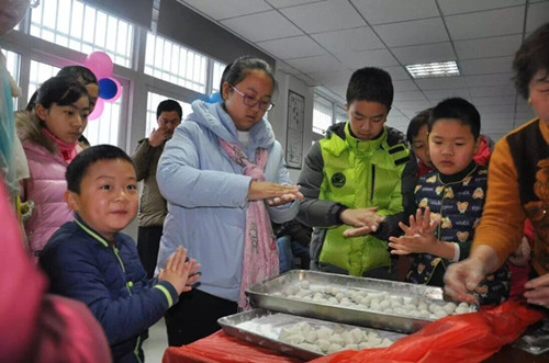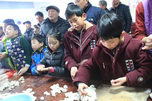 孩子們?cè)谏鐓^(qū)爺爺奶奶手把手的指導(dǎo)下學(xué)搓湯圓。從生疏好奇到熟練自如,從他們的小手里滾出一個(gè)個(gè)滾圓的湯圓,也有的孩子邊學(xué)習(xí)邊實(shí)踐,搓出來的湯圓大的大、小的小,但大家認(rèn)為開心就好。