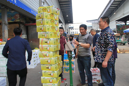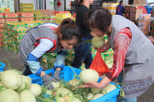在通農(nóng)物流水果交易區(qū),除了蘋果、梨、草莓等春季水果外,賣得最好的要數(shù)新上市的夏令水果,尤其各種甜瓜熱銷:青皮的玉菇、黃皮的久紅瑞,口感軟嫩 5元/500克;白皮的東方蜜,肉質(zhì)脆甜,5.5元/500克;海南的西州蜜肉黃甜脆4.5元/500克。在通農(nóng)物流西瓜專賣區(qū),品種不少,價格不一,云南西瓜2.2元/500克,山東西瓜2.8元/500克,崇明西瓜3元/500克,東臺8424西瓜3.52.8元/500克,海南麒麟瓜5元/500克,早春紅玉、特小鳳3元/500克。