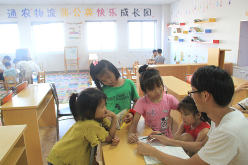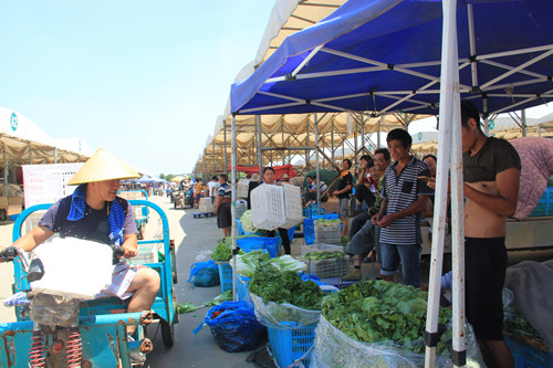 40歲的安徽人李金寶和他老婆一起在交易區(qū)賣菜,他說前年隨老鄉(xiāng)來到南通,在興仁包了50多畝地種植蔬菜,每天凌晨1點鐘起床,和老婆,另外請的兩個小工一起摘菜、裝筐、裝車到早晨8點鐘,然后開車40分鐘到通農(nóng)物流排隊、繳費,將近九點鐘開始賣,早晨在市場里買兩個大餅就著礦泉水當早餐和中飯,下午賣得快的話兩三點鐘能賣完,最晚五點鐘收攤。他說今年氣溫特別高,夏天蔬菜不澆水要干死,白天泥土是燙的,不能給蔬菜澆水,即使晚上泥土也是熱的,給蔬菜澆水的時候,泥土上騰騰的冒熱氣,很多蔬菜差不多是被燙死的,所以產(chǎn)量特別低,價錢就貴,以前青菜0.2元/斤的時候,賣不出價錢,虧了,種菜賣菜也有風險,但跟以前在建筑工地做小工比,好多了,以前苦累不算,還讓家人天天擔心,現(xiàn)在不去建筑工地了,和老婆來南通包地一起種菜賣菜,賺多賺少,家人不用擔心,通農(nóng)物流還給臨時經(jīng)營戶搭建了大棚遮陽,這比在露天建筑工地做小工日子好過多了,而且通農(nóng)物流還為外來經(jīng)營戶子女開辦了暑期輔導班——蒲公英成長園,就在水果交易區(qū)會議室,送過去很方便。南通大學志愿者和通農(nóng)物流的年輕員工義務給孩子輔導暑假作業(yè),讓大家可以安心經(jīng)營。