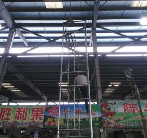 凌晨氣溫較低,水果交易區(qū)大棚內(nèi)的高空照明設(shè)備因?yàn)榈蜏負(fù)p壞,導(dǎo)致照明較弱,物業(yè)科迅速組織人員開展維修工作。本次維修的設(shè)備都在幾十米的高空,屬高空作業(yè),維修之前工作人員需要先搭建幾十米高的腳手架,做好高空作業(yè)保護(hù)措施,確保作業(yè)人員的安全,然后將腳手架移動(dòng)到需要維修的照明設(shè)備處進(jìn)行維修。維修的設(shè)施設(shè)備不多,但是維修的工作難度較大,在做好工作人員的防護(hù)措施之后,將受損的幾處照明設(shè)施進(jìn)行了修復(fù)。