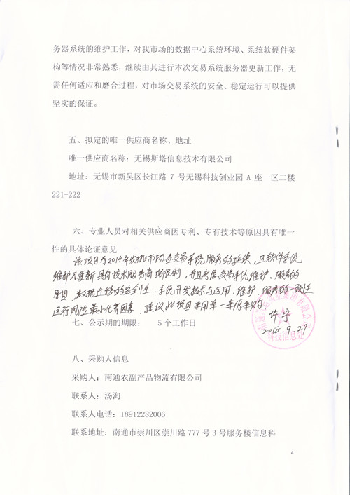 3)自2014年起,無(wú)錫斯塔信息技術(shù)有限公司在農(nóng)批市場(chǎng)進(jìn)行服務(wù)器系統(tǒng)的維護(hù)工作,對(duì)我市場(chǎng)的數(shù)據(jù)中心系統(tǒng)環(huán)境、系統(tǒng)軟硬件架構(gòu)等情況非常熟悉,繼續(xù)由其進(jìn)行本次交易系統(tǒng)服務(wù)器更新工作,無(wú)需任何適應(yīng)和磨合過(guò)程,對(duì)市場(chǎng)交易系統(tǒng)的安全、穩(wěn)定運(yùn)行可以提供堅(jiān)實(shí)的保證。