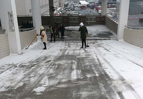 12月31日,全體現(xiàn)場(chǎng)員工一起出動(dòng)清理片區(qū)內(nèi)道路積雪。清雪期間干貨區(qū)員工擔(dān)當(dāng)掃雪主力,無一人有怨言,因?yàn)槲覀冃睦锩靼祝覀兊墓ぷ髯谥季褪恰盀榻?jīng)營(yíng)戶服務(wù)”。(干貨部 管文娟)
