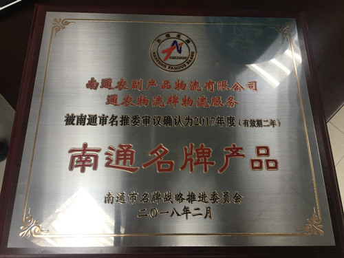 2018年2月,經(jīng)南通市名牌戰(zhàn)略推進(jìn)委員會(huì)審議確認(rèn)南通農(nóng)副產(chǎn)品物流有限公司通農(nóng)物流牌物流服務(wù)為“2017年度(有效期二年)南通名牌產(chǎn)品”。