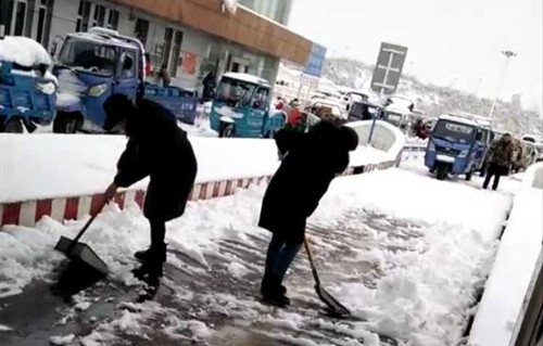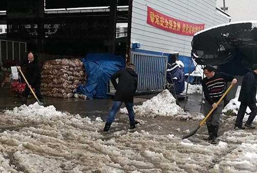 蔬菜區(qū)啟動(dòng)惡劣天氣應(yīng)急預(yù)案,在崗員工紛紛拿起鐵鍬,頂著刺骨寒風(fēng)鏟掃厚厚的積雪,為經(jīng)營(yíng)戶(hù)鏟出一條又一條安全通行道路;在彎道等重要路段撒鹽融雪,防止路面結(jié)冰,杜絕安全隱患;工作人員在棚內(nèi)加強(qiáng)安全巡查,做到防患于未然;利用場(chǎng)內(nèi)顯示屏、經(jīng)營(yíng)戶(hù)微信群,提供安全提示,提醒經(jīng)營(yíng)戶(hù)們做好防雪、防凍準(zhǔn)備,做到安全出行。
