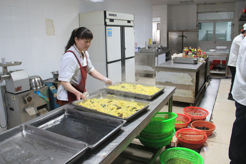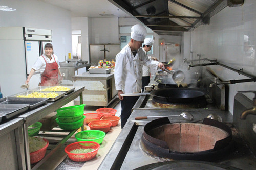 忙好早餐后,還沒來得及小喘一口,午飯的準備工作又緊鑼密鼓地開始了。各種蔬菜、肉食及水產(chǎn)品要分揀清洗,按菜譜切配成盆,再準備主食。一切都在有條不紊地進行。上午10點左右,廚房里就成了決戰(zhàn)時刻的戰(zhàn)場,廚師們手持炒鍋,在爐灶邊揮汗如雨,不斷翻炒,一鍋又一鍋的菜肴隨之出鍋,香氣四溢,令人食指大動。