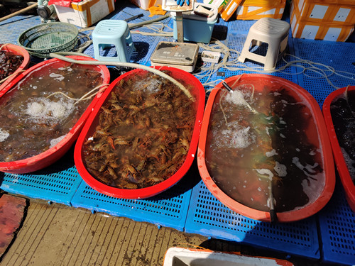 放眼水產(chǎn)交易區(qū),青蝦紅蝦大小品種不一。近期市場(chǎng)水產(chǎn)品交易也漸漸活躍,上市品種豐富,吞吐速度加快,具體呈現(xiàn)以下特點(diǎn):一是淡水魚(yú)吞吐量加快,價(jià)格回落。目前中小學(xué)、企業(yè)均已復(fù)工復(fù)產(chǎn),人口流動(dòng)量也有所增加,市場(chǎng)淡水魚(yú)的需求量明顯加大,四大家魚(yú)供應(yīng)充足。二是對(duì)蝦供應(yīng)偏緊,價(jià)格持續(xù)偏高,其他蝦類(lèi)供應(yīng)充足,目前南美白對(duì)蝦、羅氏沼蝦還都處于投苗期,所以當(dāng)前蝦類(lèi)市場(chǎng)以河蝦、白蝦、龍蝦為主。今年受疫情及各方面因素影響,龍蝦價(jià)格較往年有所下降,目前零售價(jià)大約在20——30元/斤,同比下降約20%。