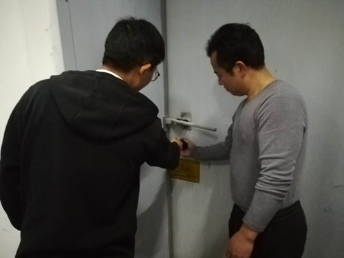 為讓商戶掌握相關(guān)技能,冷鏈部安全人員還現(xiàn)場(chǎng)演示了被困后如何正確使用逃生門。商戶詹秋明在馬鵬飛的協(xié)助下正確打開逃生門,成功”逃生”。