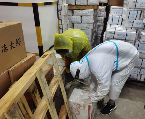 此次演練模擬了市場監(jiān)督管理局檢查人員日常檢查過程中發(fā)現(xiàn)通農(nóng)物流水產(chǎn)區(qū)某經(jīng)營戶購進的一批南美對蝦核酸檢測為陽性。隨后立即啟動進口冷鏈食品應急處置演練預案,對涉及的經(jīng)營單位開展調(diào)查,對經(jīng)營區(qū)域進行管控,對包括經(jīng)營戶在內(nèi)的所有密切接觸者進行跟蹤管理,全力追根溯源,控制事態(tài)蔓延和發(fā)展。另外,還對該經(jīng)營戶存放進口冷鏈食品的第三方冷庫進行了檢查,分別查看了該批次食品是否在江蘇冷鏈平臺規(guī)范登記,冷庫是否按要求分隔存放,進銷貨情況是否與臺賬一致等。各參演部門按照職責分工有序開展處置、溯源、流調(diào)、上報等相關工作。