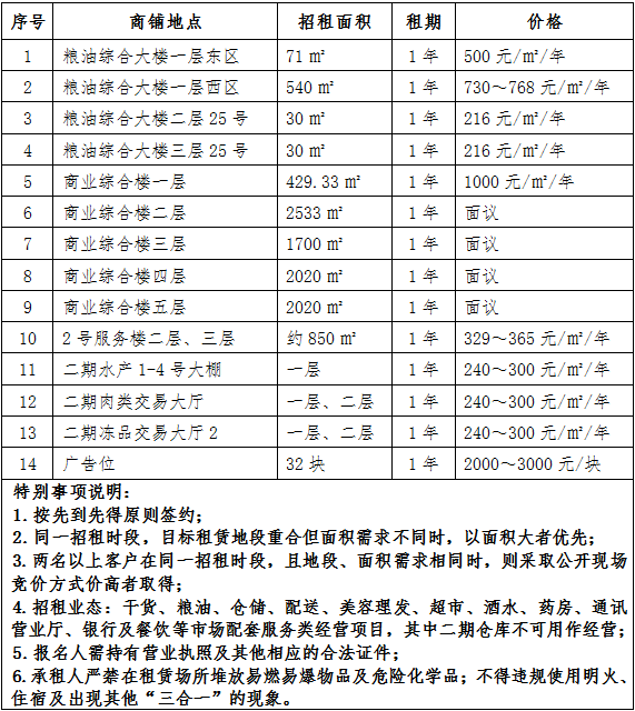經(jīng)研究,對通農物流干貨部對少量旺鋪及廣告位進行公開招租,具體信息如下: