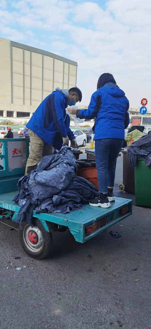 11月19日上午,商業(yè)樓保潔反映西南門出口處的垃圾桶內(nèi)有丟棄的棉布,使垃圾桶負重太大,無法及時的傾倒,影響后續(xù)使用,且存在一定的安全隱患。根據(jù)文明城市創(chuàng)建的相關(guān)要求,干貨區(qū)立即組織人員進行清理,在干貨區(qū)管理王曉翠的帶領(lǐng)下大家戴上手套,擼起袖子,齊心協(xié)力將棉布從垃圾桶里取出,用三輪車運到糧油后場地等待處理。