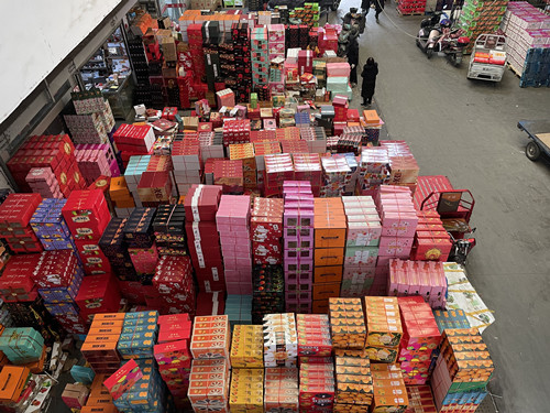 一眼望去,贛南臍橙、阿克蘇蘋果、陜西獼猴桃、海南西瓜、廣西砂糖橘、智利車?yán)遄印⑻﹪堁邸鞣N水果應(yīng)有盡有,貨源供應(yīng)充足,各種水果精品禮盒摞成小山,目前普通水果銷售火爆,禮盒銷售也漸入佳境。