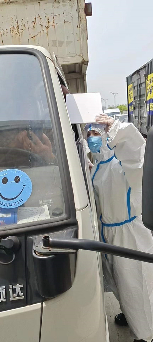 疫情就是命令,防控就是責(zé)任。為打贏疫情防控攻堅(jiān)戰(zhàn),配送直營部根據(jù)公司的要求安排工作人員在南門做好支援工作。疫情防控工作是辛苦的,每日到崗前認(rèn)真做好防護(hù)是她們一天工作的開始。面對(duì)每天經(jīng)過面前的車流人流,她們需要認(rèn)真負(fù)責(zé)查驗(yàn)前往市場(chǎng)車輛人員的健康碼、行程碼及24小時(shí)核酸檢測(cè)報(bào)告,要做到不漏一人,不漏一項(xiàng)。在這特殊時(shí)期,疫情防控是首要任務(wù),工作人員需要對(duì)各項(xiàng)日常工作進(jìn)行時(shí)間上的安排,在做好南門支援工作的同時(shí)日常工作也不能松懈。