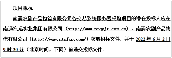 南通通城建設工程項目管理有限公司(以下稱代理機構)受南通農(nóng)副產(chǎn)品物流有限公司 (以下稱采購人)的委托,就其南通農(nóng)副產(chǎn)品物流有限公司各交易系統(tǒng)服務器采購項目組織公開招標,誠邀符合條件的潛在投標人參加投標。
