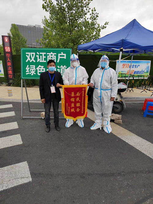 因為此次及時挽回了市場干貨區(qū)商戶的冰糖、飲料,水果區(qū)商戶的西瓜及榴蓮,得到市場經營戶由衷地感謝。5月19日早上6點,水果區(qū)經營戶王發(fā)華就親自到南大門一線防疫卡口送上錦旗,錦旗上印有“勇擒盜賊,為民服務”。這面紅艷艷的錦旗,承載著經營戶對通農物流員工的肯定與支持,是滿含著真摯的感謝與誠摯的敬意。