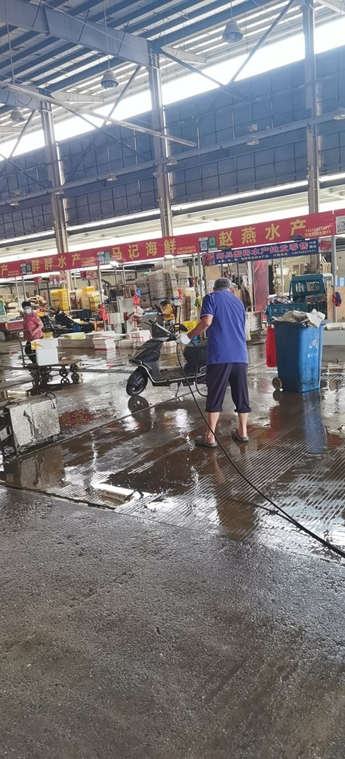 6月15日,水產(chǎn)肉類交易區(qū)主管范淵帶領(lǐng)當(dāng)班人員、保潔人員對交易場地地面進(jìn)行了全面沖洗,同時對亂堆放進(jìn)行了集中整治,還大家一個干凈、整潔的交易環(huán)境。(水產(chǎn)區(qū) 陳旭鵬)