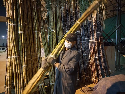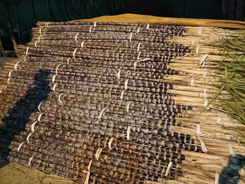 在甘蔗銷售區(qū)域,一捆一捆的甘蔗被運(yùn)送到貨車上。甘蔗按品種一般可以分為兩種,一種是青皮甘蔗,一種是紫皮甘蔗。從口感上來講,青皮的更甜一些,更脆一些;從性質(zhì)上講,青皮性涼,有清熱的效果,而紫皮性溫,可滋補(bǔ);從外觀上看,青皮的節(jié)要長一些;從價格上講,青皮的略微高一點(diǎn)。商家李先生說:“這些甘蔗因?yàn)橹唷⑽短稹⑵焚|(zhì)好吸引了很多本地和外地客商前來采購。”甘蔗都是按捆來交易的,一捆10根左右,青皮甘蔗價格在180-200元/捆,紫皮甘蔗價格在110-135元/捆。