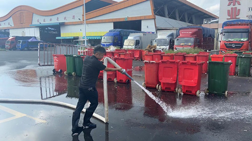 通農(nóng)物流水果區(qū)安全管理主辦茅小飛和現(xiàn)場(chǎng)網(wǎng)格員潘飛俠手持水槍?zhuān)瑢?duì)垃圾場(chǎng)地進(jìn)行洗刷,原本“灰頭土臉”的垃圾場(chǎng)地變得干凈如新,有效美化了市容環(huán)境。垃圾桶是生活及交易垃圾的主要投放處,蚊蠅在垃圾桶內(nèi)外聚集,容易滋生細(xì)菌。建議廣大經(jīng)營(yíng)戶(hù)養(yǎng)成良好的生活習(xí)慣,自覺(jué)把垃圾分類(lèi)投入垃圾桶,特別是垃圾中有湯水的,要用塑料袋裝好、扎緊,盡可能減少環(huán)境污染。