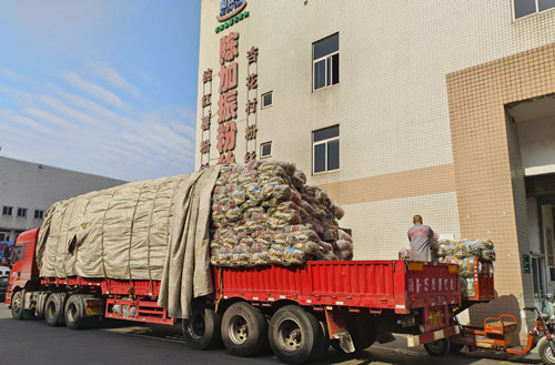 11月30日,在通農(nóng)物流干貨交易區(qū)5號(hào)大廳南側(cè),一車杏花村牌精品紅薯粉絲正在卸貨,杏花村牌的紅薯粉絲以鮮薯為原料,久煮不糊,清香可口,可搭配多種食材烹飪。