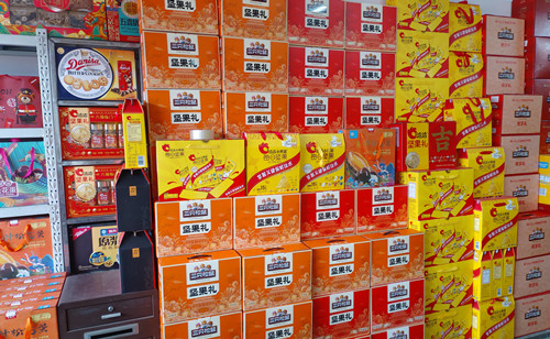 近日,通農(nóng)物流干貨交易區(qū)的商戶們開始陸續(xù)在微信朋友圈中打出堅果禮盒上新廣告,吸引顧客前來選購。在商戶店鋪內的貨架上,擺滿了多種品牌的堅果禮盒,這些禮盒內包含了夏威夷果、巴旦木、碧根果、腰果、核桃等堅果,還夾雜了一些蔓越莓干、黑加侖、藍莓等果干類食品。