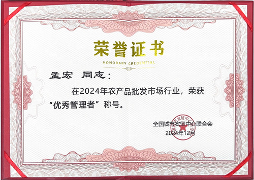 12月3日,全國(guó)城市農(nóng)貿(mào)中心聯(lián)合會(huì)召開“2024年中國(guó)農(nóng)產(chǎn)品批發(fā)行業(yè)年會(huì)暨第八屆中國(guó)農(nóng)產(chǎn)品供應(yīng)鏈大會(huì)”,會(huì)上通農(nóng)物流榮獲 “2024年度農(nóng)產(chǎn)品批發(fā)市場(chǎng)行業(yè)經(jīng)銷商最滿意市場(chǎng)”稱號(hào),同時(shí)蟬聯(lián)“2023年度農(nóng)產(chǎn)品批發(fā)市場(chǎng)行業(yè)百?gòu)?qiáng)市場(chǎng)”,總經(jīng)理孟宏榮獲“2024年農(nóng)產(chǎn)品批發(fā)市場(chǎng)行業(yè)優(yōu)秀管理者”榮譽(yù)稱號(hào)。
